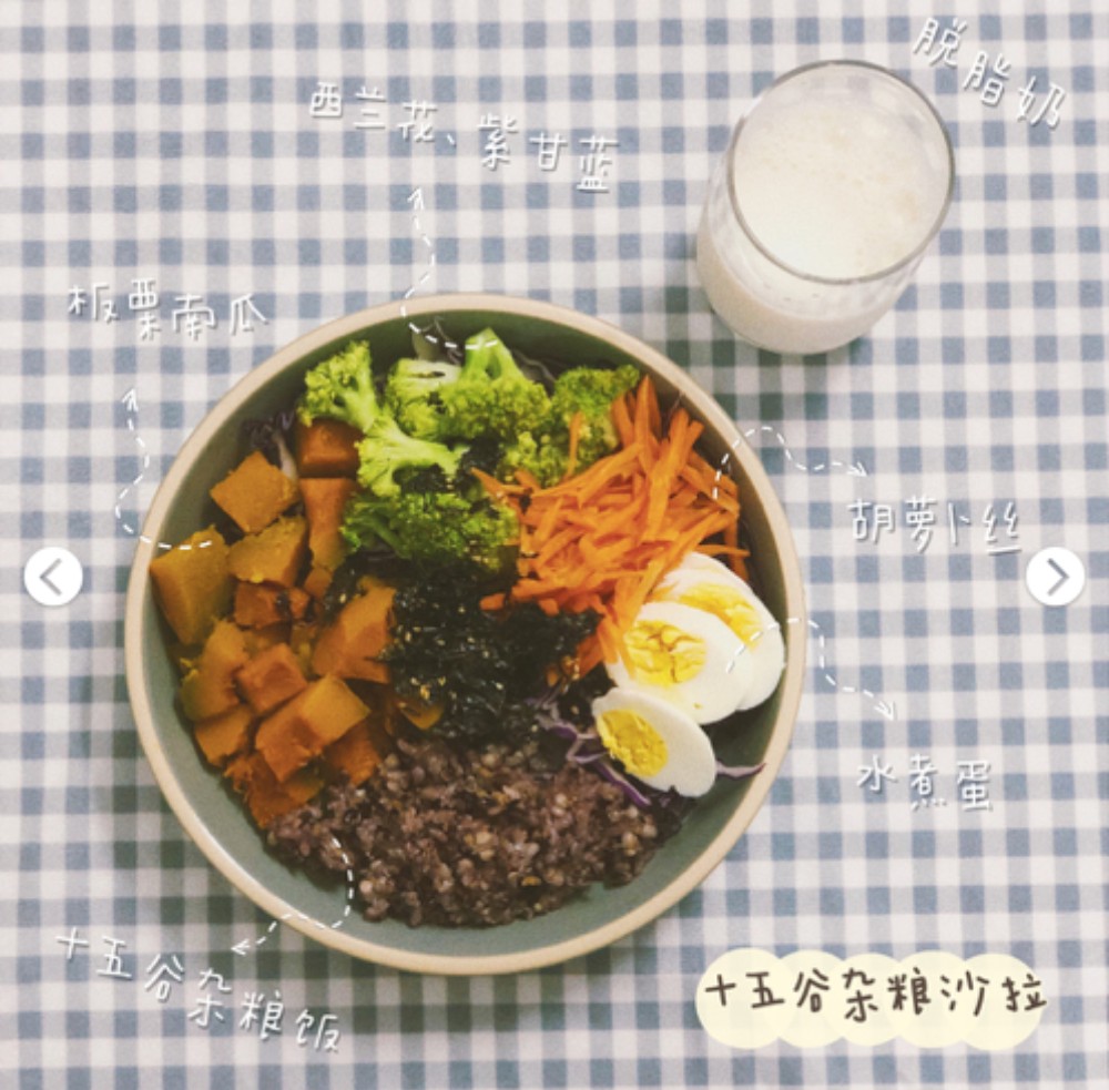 十五穀雜糧飯+板栗南瓜+花椰菜+紫色甘藍+胡蘿蔔絲+水煮蛋+脫脂牛奶