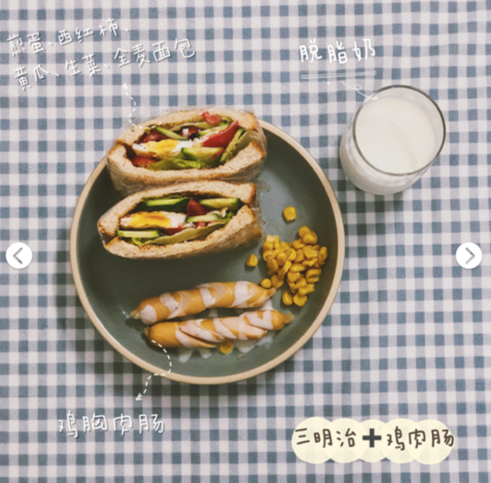 全麥麵包+煎蛋+西紅柿+黃瓜+生菜++雞胸肉香腸+玉米粒+脫脂牛奶